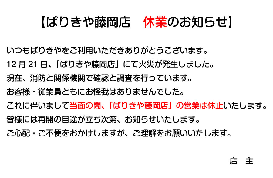 - 藤岡店休業のお知らせ